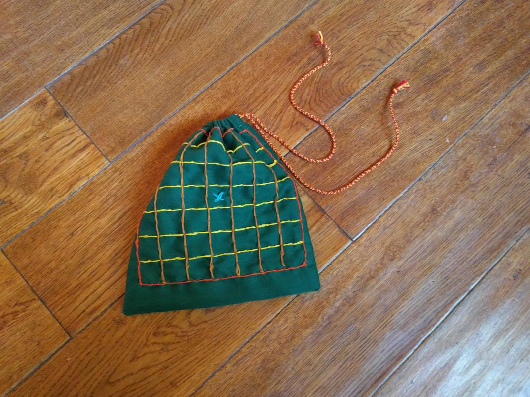 This was a really fun project to work on, though I got a little impatient and took some shortcuts and made wider stitches than would have been preferable. The project is a fairly basic bag/pouch with a draw cord (that I made myself by doing a five loop (ten strand) fingerloop braid with embroidery floss—a project within a project, as is often the case).