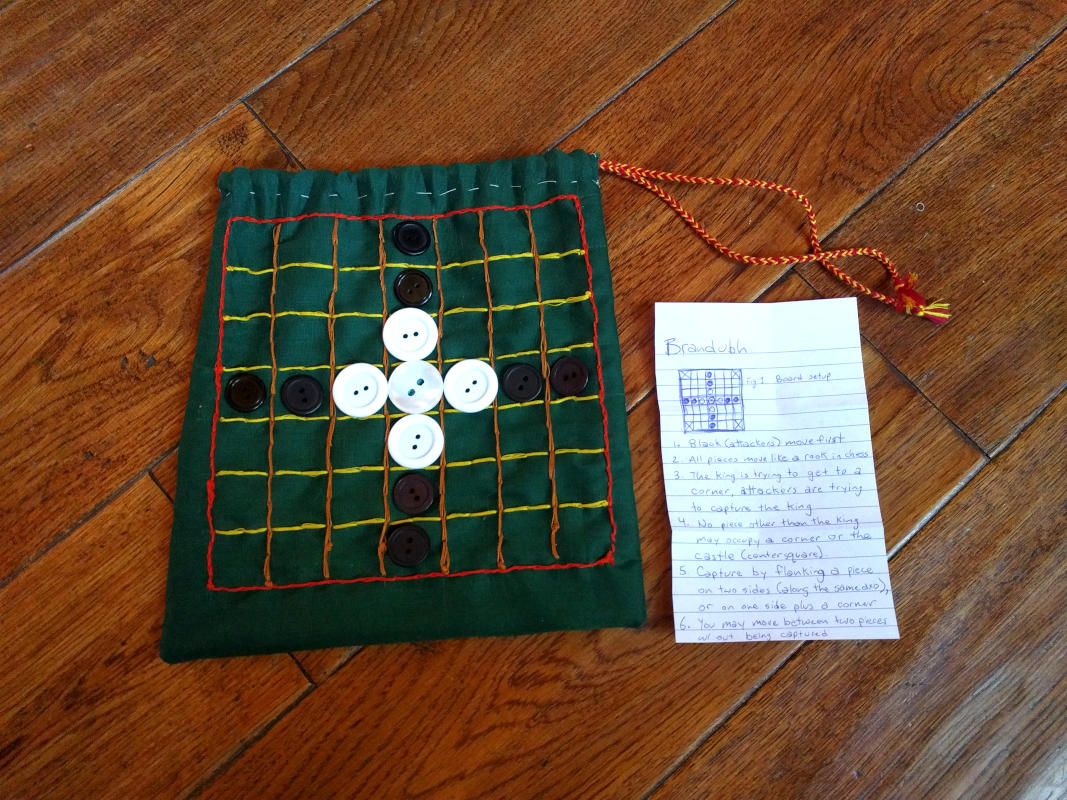 Brandubh is an old game with many versions of the rules that have been reconstructed from old poems and manuscripts. Here are the rules I have written down for use when playing the game: