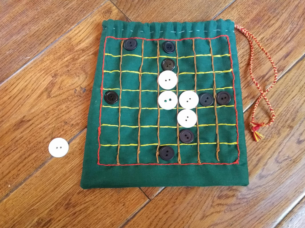 I am pretty happy with how it came out, though I had my doubts while crafting it. My daughter and I have played many games on it. We used buttons for the pieces (8 black, four white, and one white with a nacreous sheen to it (for the king/cheiftan/lor/leader/etc). I am also really happy with the fingerloop braid used as the cord. I have made five loop braids of this sort a number of times before and always really like them. I used three red strands, one yellow, and one orange to make the cord.